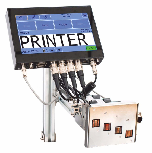 Стабильность достигается за счёт энкодера. Он считывает фактическую скорость движения продукта и передаёт её маркиратору в реальном времени. Если конвейер ускоряется или замедляется, КПМ-6200 автоматически подстраивает момент срабатывания сопел. Символы не растягиваются и не сжимаются, шрифт остаётся читаемым при любой скорости в диапазоне до 50 м/мин.
